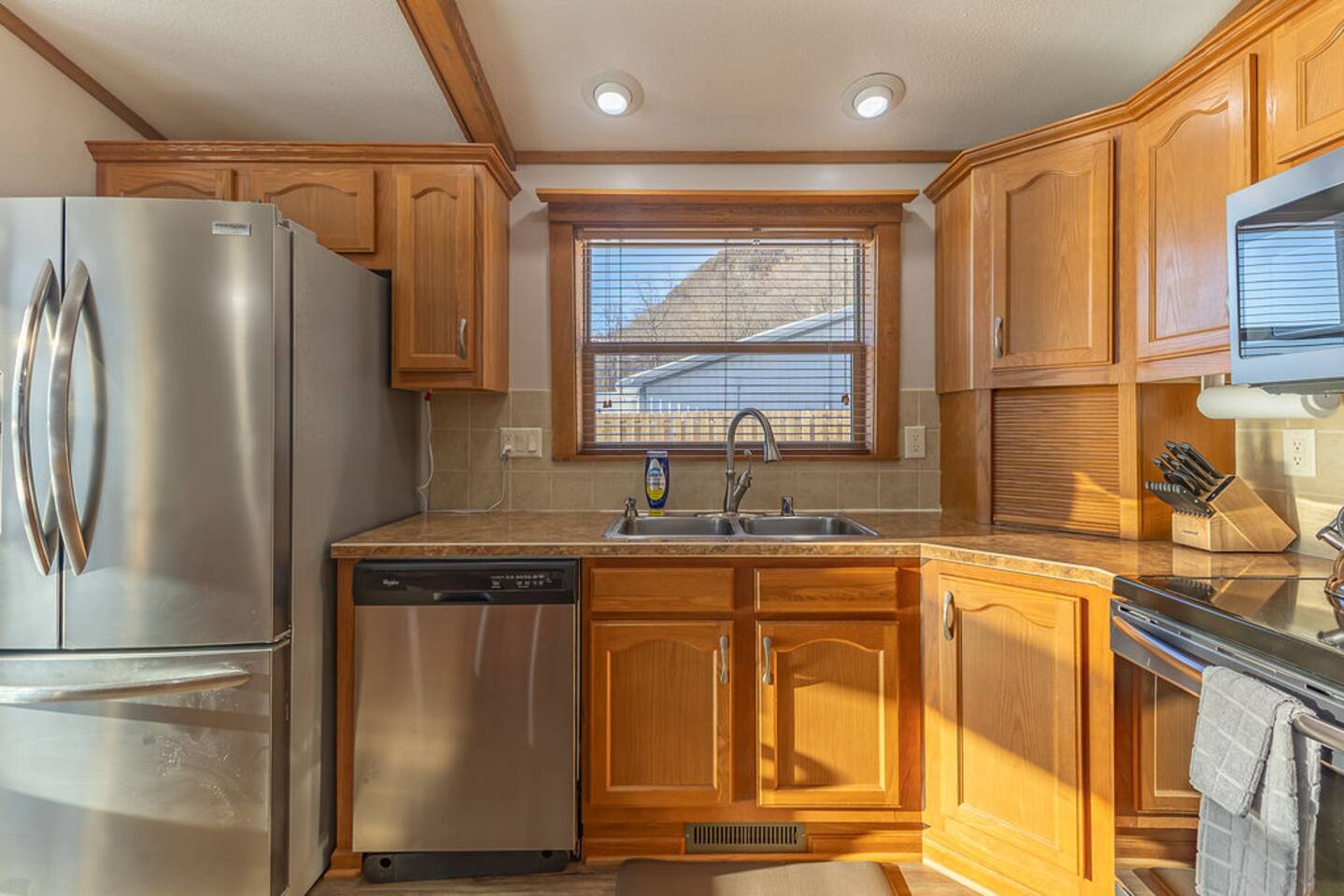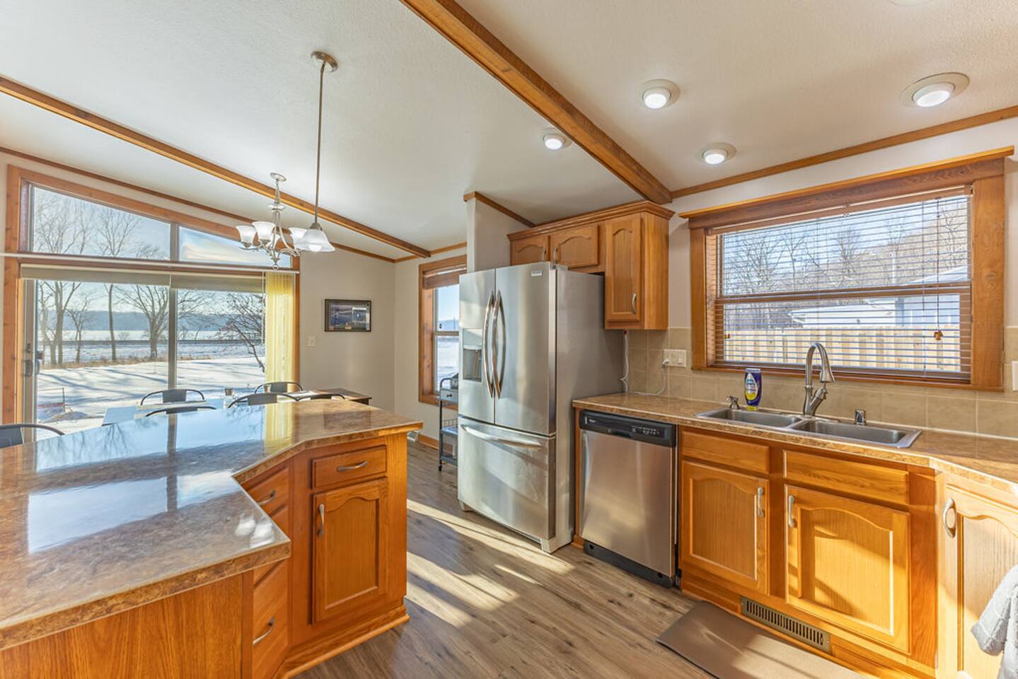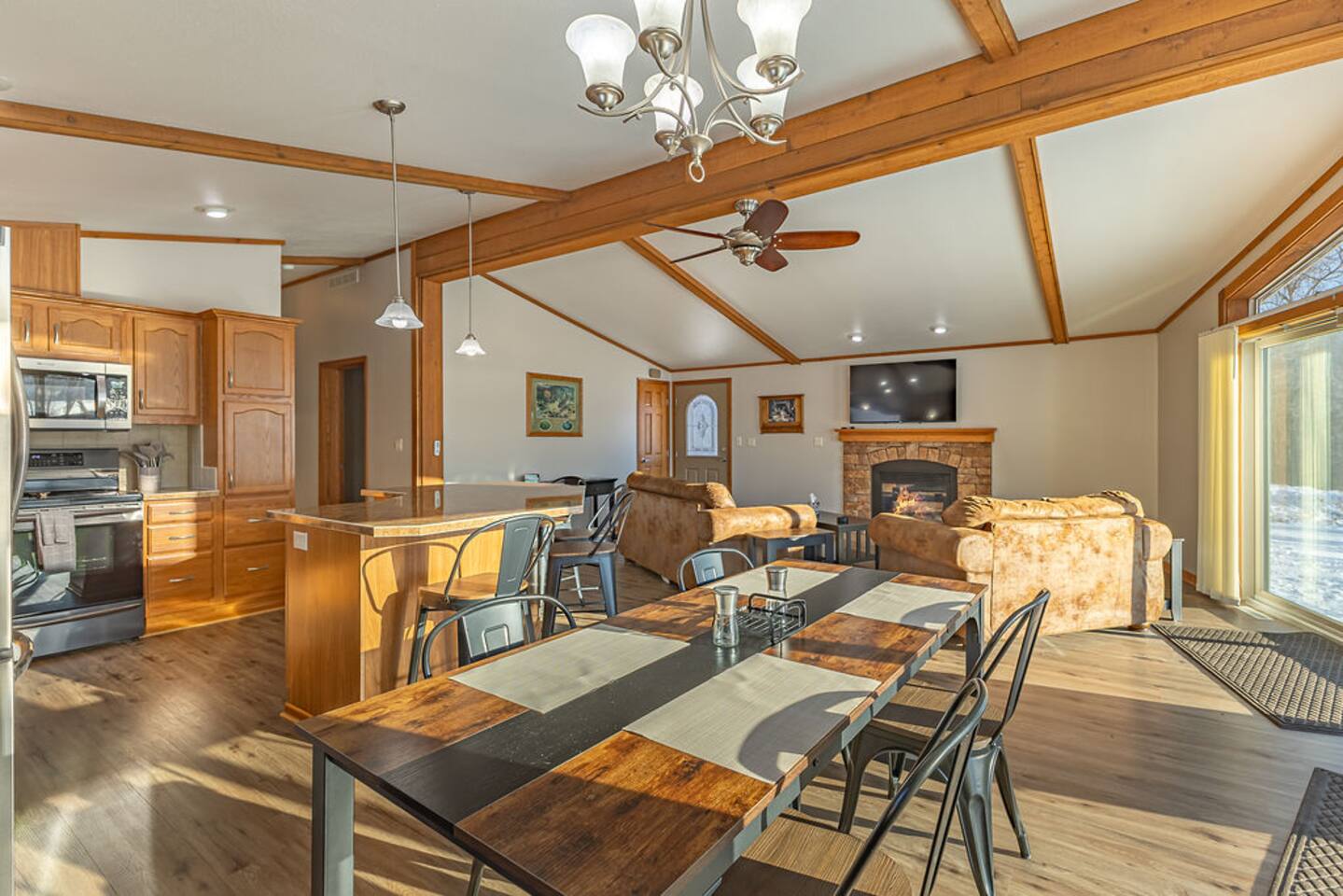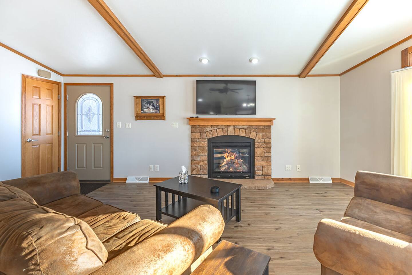 Step inside and enjoy brand-new flooring, fresh interior paint, and a warm open layout with vaulted ceilings that make the space feel airy and inviting. The living room features a cozy fireplace and large windows that frame the natural surroundings. New Anderson patio doors open to the outdoors, extending your living space and bringing in soft natural light.